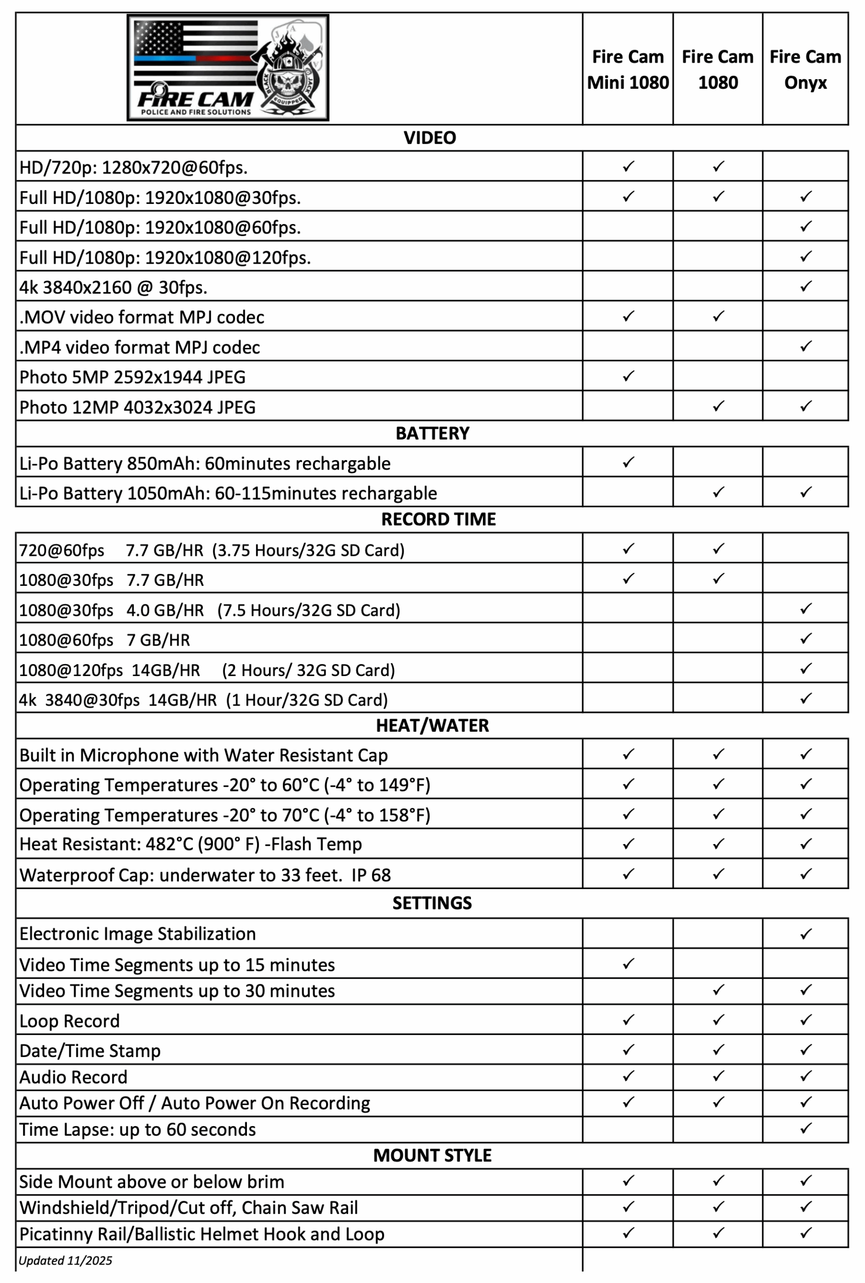 All Fire Cam Helmet Cameras®are made of heat resistant anodized aluminum with a heat resistant glass lens specifically designed for interior firefighting. The Fire Cam® 1080 with Mount has been a staple for Fire Cam® with its extended battery life and quality. Recording in HD 720p @ 60 fps and Full HD 1080p @ 30 fps, with a high-quality lens, gives this camera a leading advantage. A rock of durability, the Fire Cam® 1080p helmet camera can take on temperatures upwards of 900F for short periods of time and continue recording. The name Fire Cam® is known around the world for its quality and dedication to Public Safety.